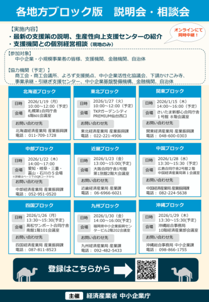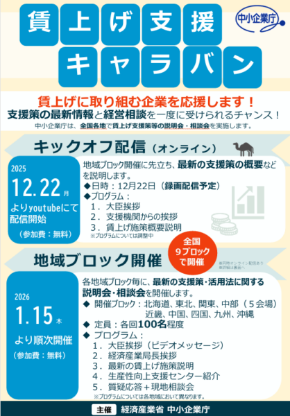 経済産業省では、中小企業・小規模事業者の賃上げ支援のために、全国で施策広報のためのキャラバンイベントを実施します。賃上げに関する施策の最新の内容をご紹介するとともに、現地での個別相談会も併催されます。多くの事業者の皆様に賃上げ支援に関する施策をわかりやすくご紹介しますので、お気軽にご参加ください。