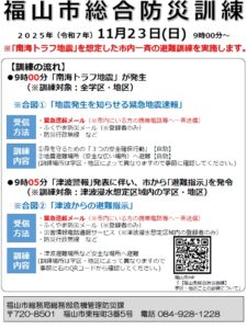 2025年(令和7年11月23日(日)9:00より「南海トラフ地震」を想定した市内一斉の避難訓練が実施されます。